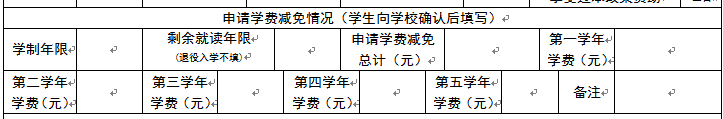 3、申请学费减免情况需要学生向学校财务处确认后填写。“剩余就读年限”指“学制年限减去入伍前已读年限”;“申请学费减免总计”填写剩余年限学费总和,后面每学年学费从第一学年开始填写。如学制4年,大一读完应征入伍,剩余年限读3年,分别填写第一学年、第二学年、第三学年。