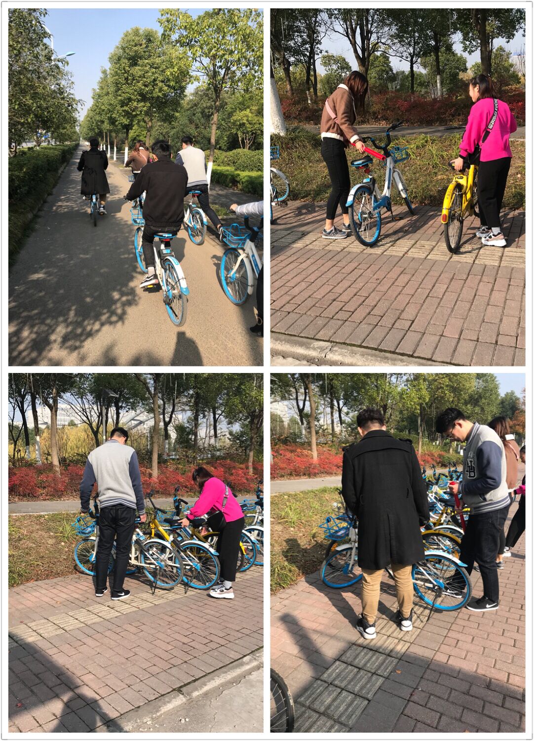2.志愿者公益服务篇。骑行到达本次活动的目的地皖江财富广场后,支部全体党员立刻转换身份成为社会公益服务志愿者,大家寻找附近停放不合理的共享单车,将路边乱停乱放的单车归位摆放整齐,并对占用公共盲道、绿道、消防通道等处的共享单车归位排放,你推我扛,相互协作,撸起袖子加油干,冬日午后的暖阳洒在身上,同学们的额头上沁出了暖心的汗珠。