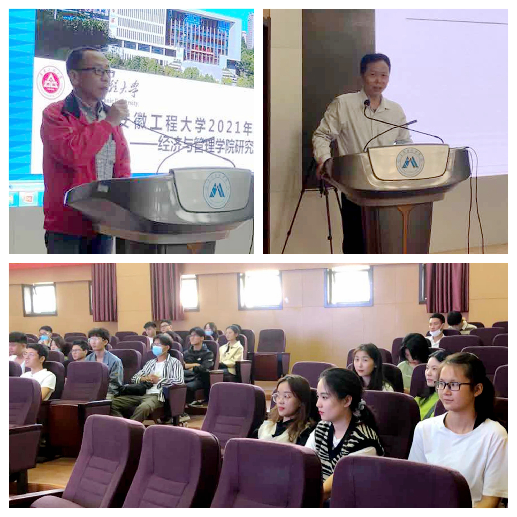 章秀琴教授、潘明明博士和刘鹏博士在安徽信息工程学院与同学们进行了专题讲座,解读了考研各环节的注意事项及应对技巧,详尽地解答了同学们关于备战考研的各类疑惑,鼓励大家早下决心早动手准备。并重点介绍了我院管理科学与工程、产业经济学硕士点的基本情况。