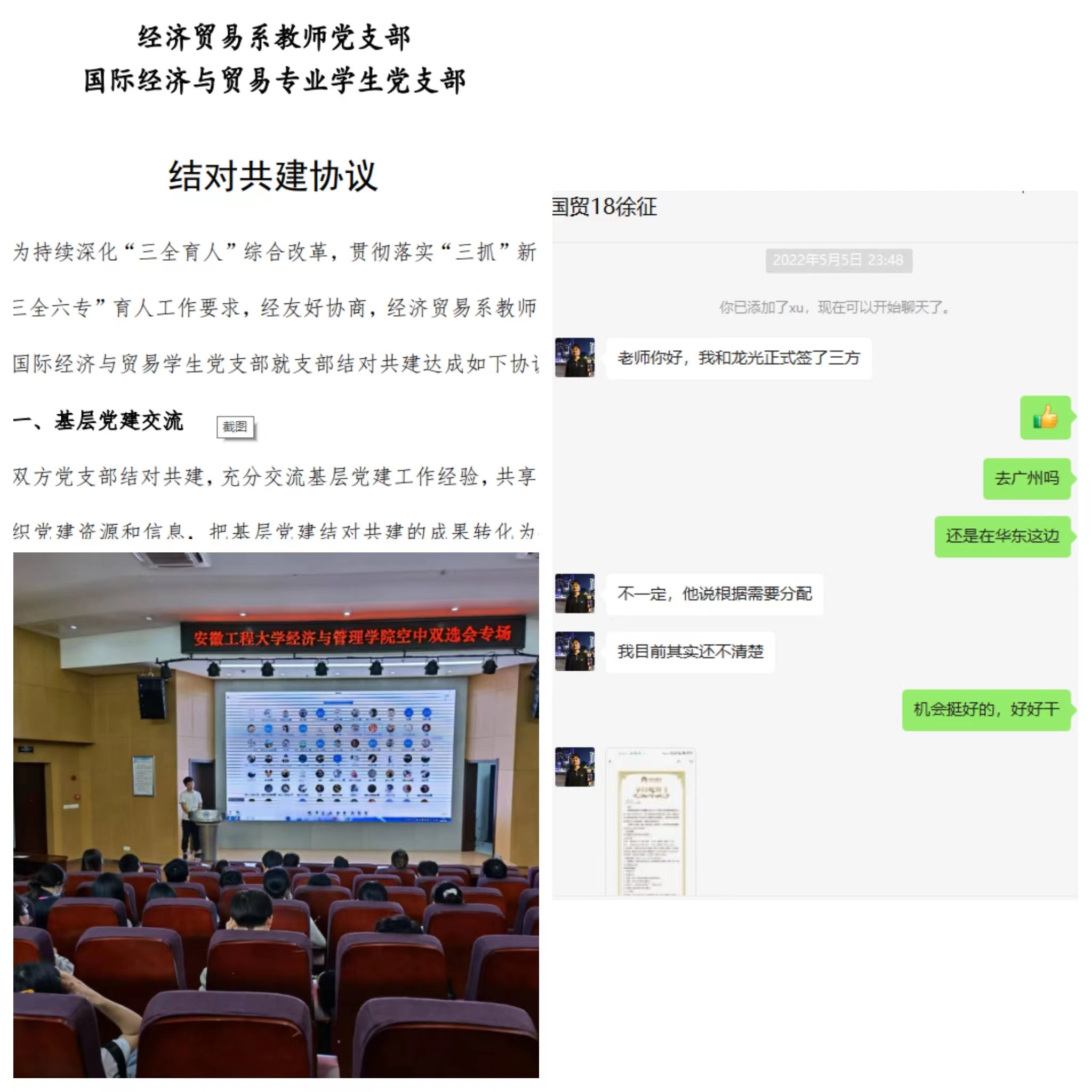 为深入贯彻落实学校党委“三抓”和“三全六专”育人工作要求,提升基层党支部党建工作质量和抓党建促发展的能力与水平,经济与管理学院经济贸易系教师党支部坚持以学生为中心,本着“资源共享、优势互补、共谋发展”的原则,主动联合结对本系学生党支部、跨学院师生党支部,在就业、学科竞赛、学子考研等方面实现共建、共享、共赢以助力人才培养。