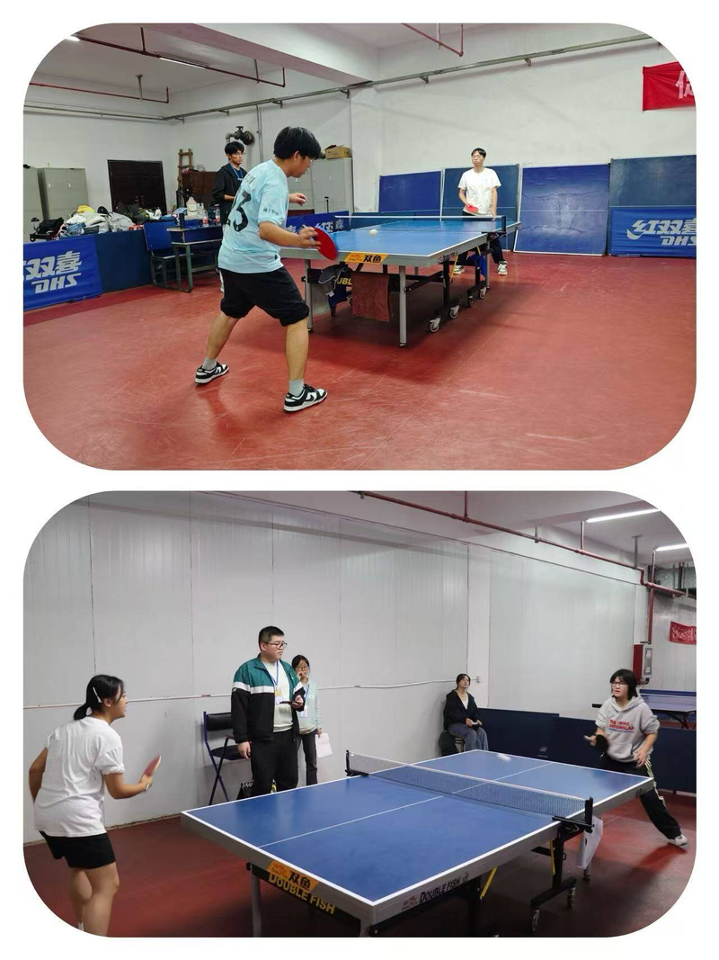 比赛现场,四张比赛球台被前来观赛的师生层层环绕,成为乒乓球馆最亮眼的“竞技场”。双方选手热身完毕,裁判到位,各赛场同步开赛,清脆的“乒乓” 球撞击声与观众的欢呼声交织在一起,奏响热烈的竞技序曲。赛场上,选手们状态饱满、专注投入;赛场下,观众们紧盯球路,为每一次精彩回球鼓掌喝彩,为暂时落后的选手加油鼓劲。同时,赛场的工作人员们分工明确、认真负责,用细致的后勤服务保障赛事有条不紊推进。整个赛场既充满 “针尖对麦芒” 的竞技张力,又洋溢着互助友爱的青春温情。