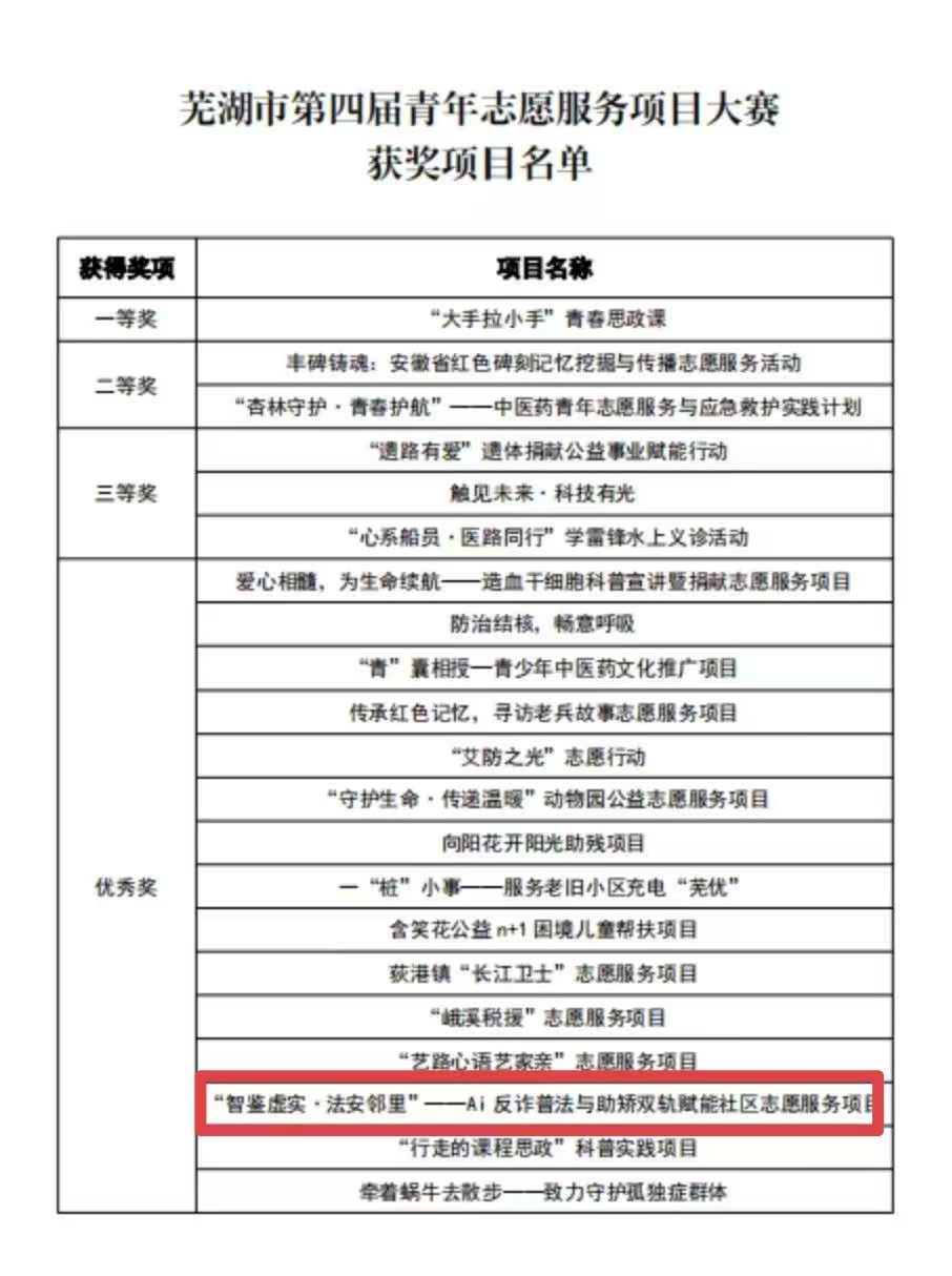人文学院“阳光之旅”青年志愿者服务队“智鉴虚实·法安邻里”项目获芜湖市青年志愿服务项目大赛优秀奖