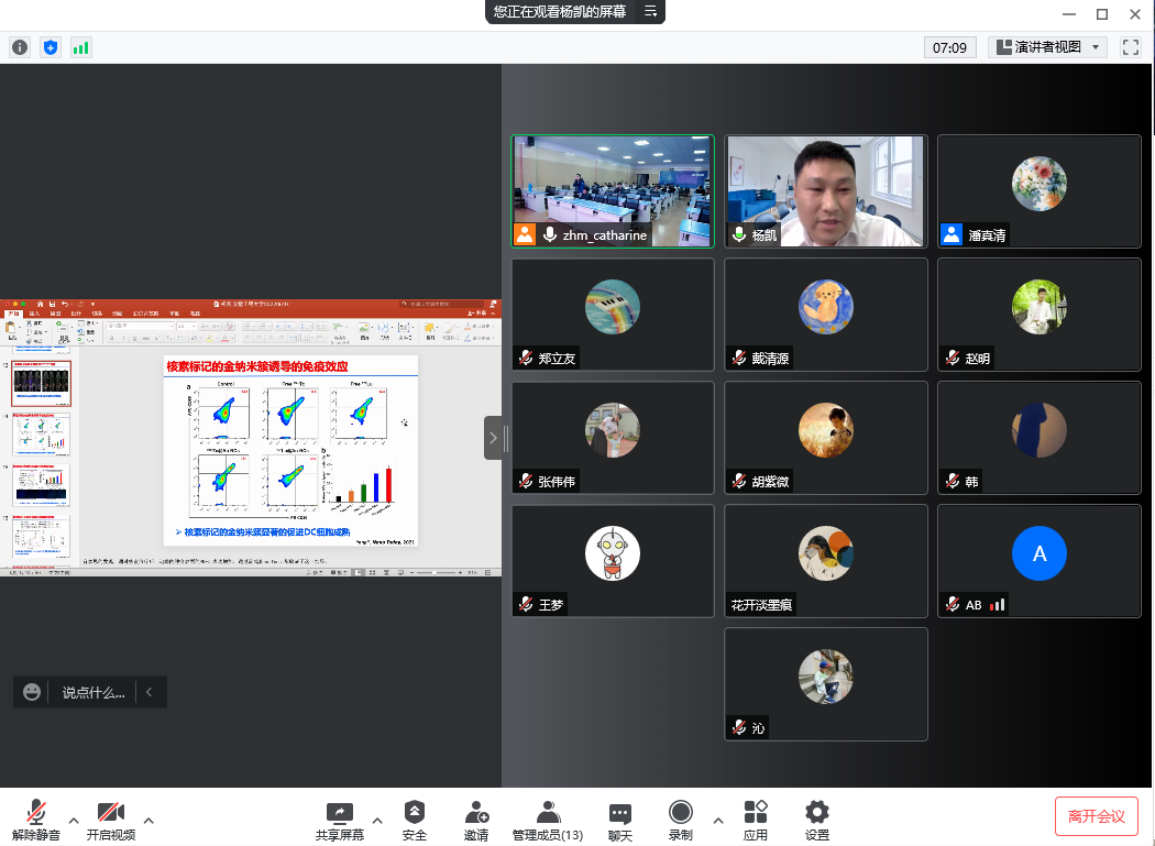 杨凯教授围绕自己带领的研究团队发明的一项科研成果进行学术交流。将有治疗功能的放射性同位素碘131标记在过氧化氢酶上,然后将其与免疫佐剂CpG以及海藻酸钠混合得到复合注射液对肿瘤进行原位治疗。通过海藻酸钠原位成胶可将其他组分固定于瘤内,在较低的放射性剂量下,通过单次注射可在小鼠肿瘤模型、人源异种移植模型以及兔肿瘤模型上完全杀灭原位实体瘤;在此基础上,CpG作为免疫佐剂可与内放疗后肿瘤残留物相互作用,产生肿瘤特异性的免疫反应,通过联用免疫检查点抑制剂,可利用机体自身的免疫系统追击远端转移的肿瘤细胞,从而抑制肿瘤转移。该方法理论上可适用于多种类型的实体瘤,有可能给那些已经发生肿瘤转移且不能通过手术或化疗治愈的中晚期患者带来新的机遇。