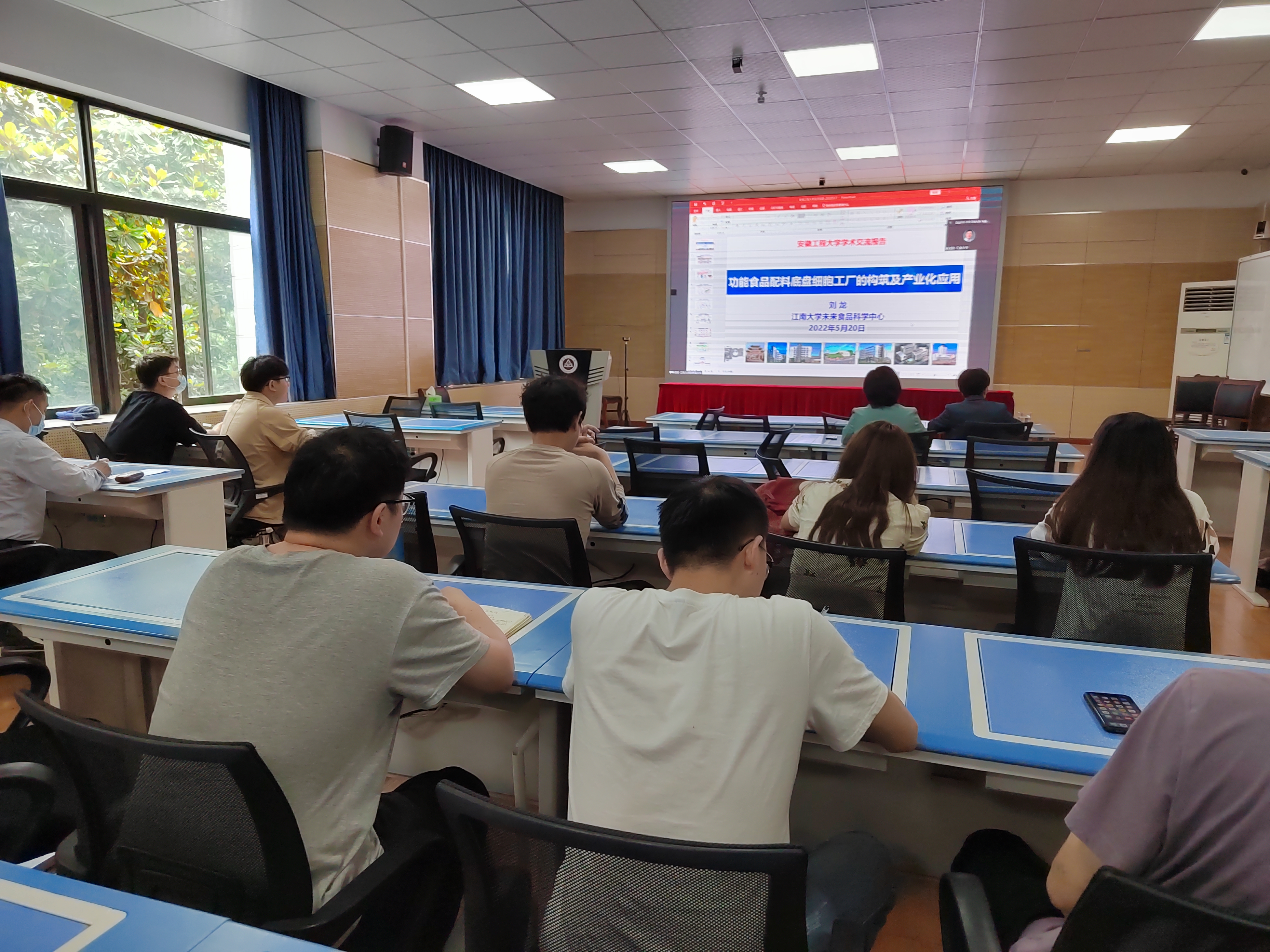 520日下午,在我院虚拟仿真中心,江南大学刘龙教授受邀为我院师生线上作学术报告。刘教授报告题目分别为“功能食品配料底盘细胞工厂的构筑及产业化应用”。参加报告会的有学院党政领导,我院研究生和部分相关专业的教师。会议由院长薛正莲主持。
