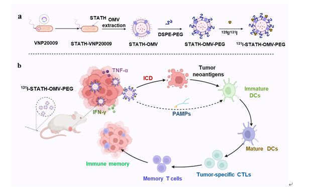 内放射性同位素治疗(RIT)作为临床上治疗肿瘤的重要方法之一,不仅可以直接杀死肿瘤细胞,还能通过诱导肿瘤细胞的免疫原性死亡(ICD)来增强抗肿瘤免疫应答。为了在肿瘤部位实现放射性核素的靶向输送,已经开发了多种生物相容性的纳米载体,以提高治疗效率并最小化副作用。然而,传统的放射性标记纳米载体面临放射标记效率低和肿瘤靶向性差的挑战,这极大地限制了RIT的疗效。近年来,细菌外膜囊泡(OMV)作为一种由革兰氏阴性菌分泌的天然纳米囊泡,在癌症治疗中显示出良好的肿瘤靶向性和作为药物递送载体的潜力。此外,OMV还具有促进免疫细胞分泌干扰素,激活抗肿瘤免疫应答的潜力。
