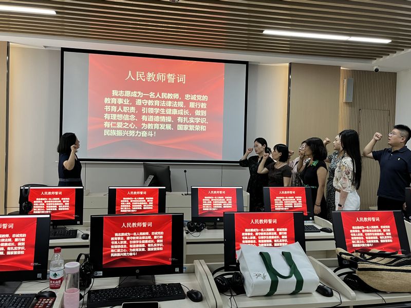 支部党员集体学习了习近平总书记关于教育的重要论述。通过学习,党员教师们深刻认识到,教育不仅是知识的传授,更是灵魂的塑造,是引导学生树立正确人生观、世界观、价值观的关键。活动中,党员教师们还围绕“如何在新时代背景下更好地践行教育家精神,成为新时代的‘大先生’”展开了热烈讨论。大家一致认为,作为新时代的教师,不仅要精通专业知识,更要具备高尚的道德情操和仁爱之心,以实际行动影响和激励学生,成为他们成长道路上的引路人。支部书记苏涛带领全体党员教师重温了人民教师誓词,铿锵有力的誓言,不仅是对过往教育生涯的回顾与致敬,更是对未来教育事业的承诺与宣誓。每一位党员教师的脸上都洋溢着坚定与自豪,他们深知,作为教育工作者,肩上承载着教书育人的重任。