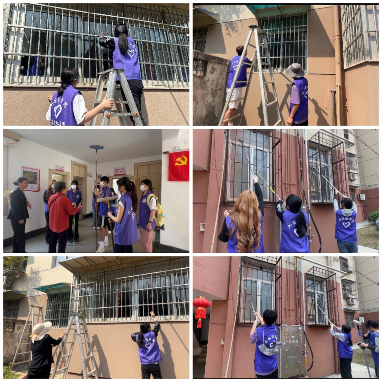 为践行雷锋精神,深化劳动教育实践,3月26日下午,外国语学院联合后勤保障处、万豪城市管理有限公司走进教工区14栋神东社区侨联工作站,开展“擦亮文明之窗传递志愿微光”劳动实践活动。紫阳花志愿服务团队12名志愿者参加。