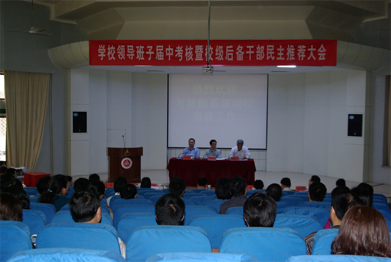 大会分两个阶段进行:一是进行校级领导班子届中考核;二是进行校级后备干部民主推荐。省委教育工委常务副书记张荣国同志分别对校级领导班子届中考核和校级后备干部民主推荐两项工作进行了动员,并提出了要求。在党委书记陈其工同志代表学校党委作述职述廉暨干部选拔任用情况报告和校长干洪同志代表学校行政班子作述职述廉报告后,与会人员认真填写了民主测评和民主评议表,对学校领导班子和七位校领导分别进行了民主测评和民主评议,并对校级后备干部进行了民主推荐。