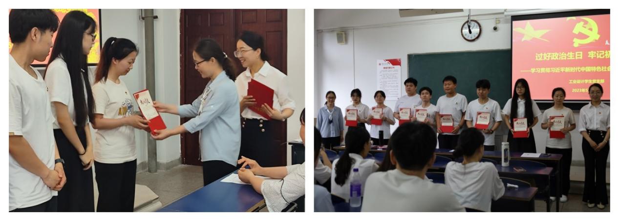 在政治生日会上,设计学院党委副书记彭海燕为2022年5月31日发展的8名党员赠送印有党员姓名、入党时间及入党誓词的“政治生日”贺卡,并送上组织寄语,传递温情与关爱,寄予殷切嘱托与期望,勉励党员要努力践行入党初心,认真履行党员义务,为实现中华民族伟大复兴的中国梦奉献力量。