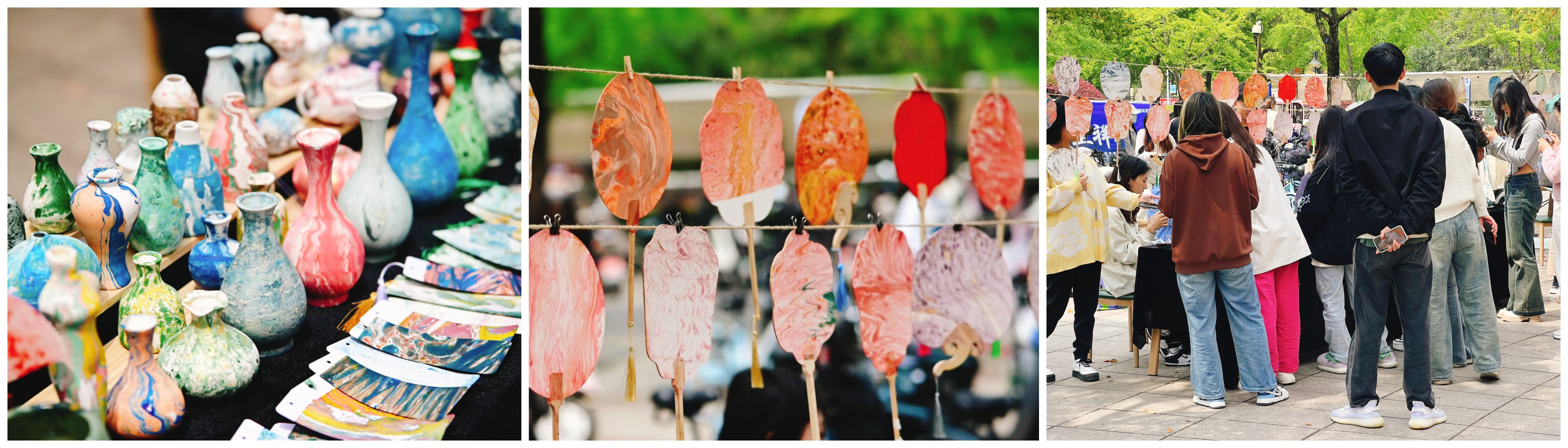展览现场,一幅幅漆艺作品熠熠生辉,散发出独特的艺术魅力。参观者纷纷驻足观赏,对漆艺的卓越技艺和丰富内涵给予了高度评价。“漆艺,是我国传统工艺中的瑰宝。漂漆技法常见于漆画,是以浮于水的稀释剂调和大漆,以点、甩、弹、划等手法进行创作的一种艺术。”活动现场,展览负责人现场讲解、亲手示范,展示漂漆工艺的历史渊源、制作流程和技术要点。在专人的指导下,现场参观的同学们将大漆颜料进行调配,再将空白的扇面浸入染缸,漆水便随着水流慢慢附着在扇面上,漆水散开后,缤纷缥缈的色彩图案跃然纸上,似云涛,仿山花,如涟漪,妙趣横生,给人无限遐想和美的享受。活动现场参与的同学说:“在春晚看到《上春山》中的漆扇就特别喜欢,之前还专门去搜索了相关的制作技艺,这次通过设计学院举办的活动,让我在水中挥洒着色彩,充分感受到传统技艺和非遗艺术的魅力。”