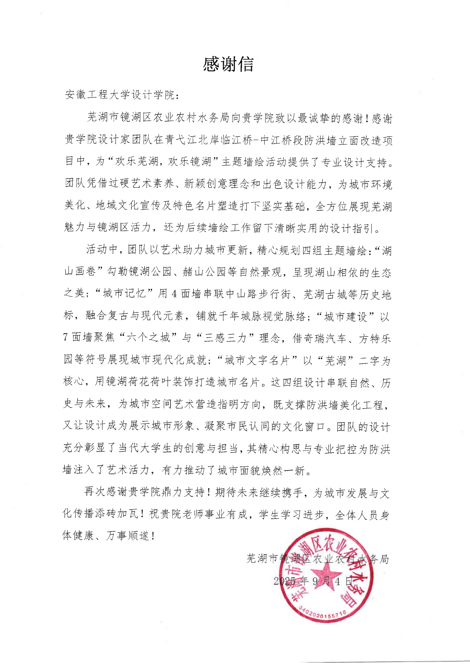 以设计赋能城市,用青春书写担当——设计学院收到芜湖市镜湖区农业农村水务局感谢信