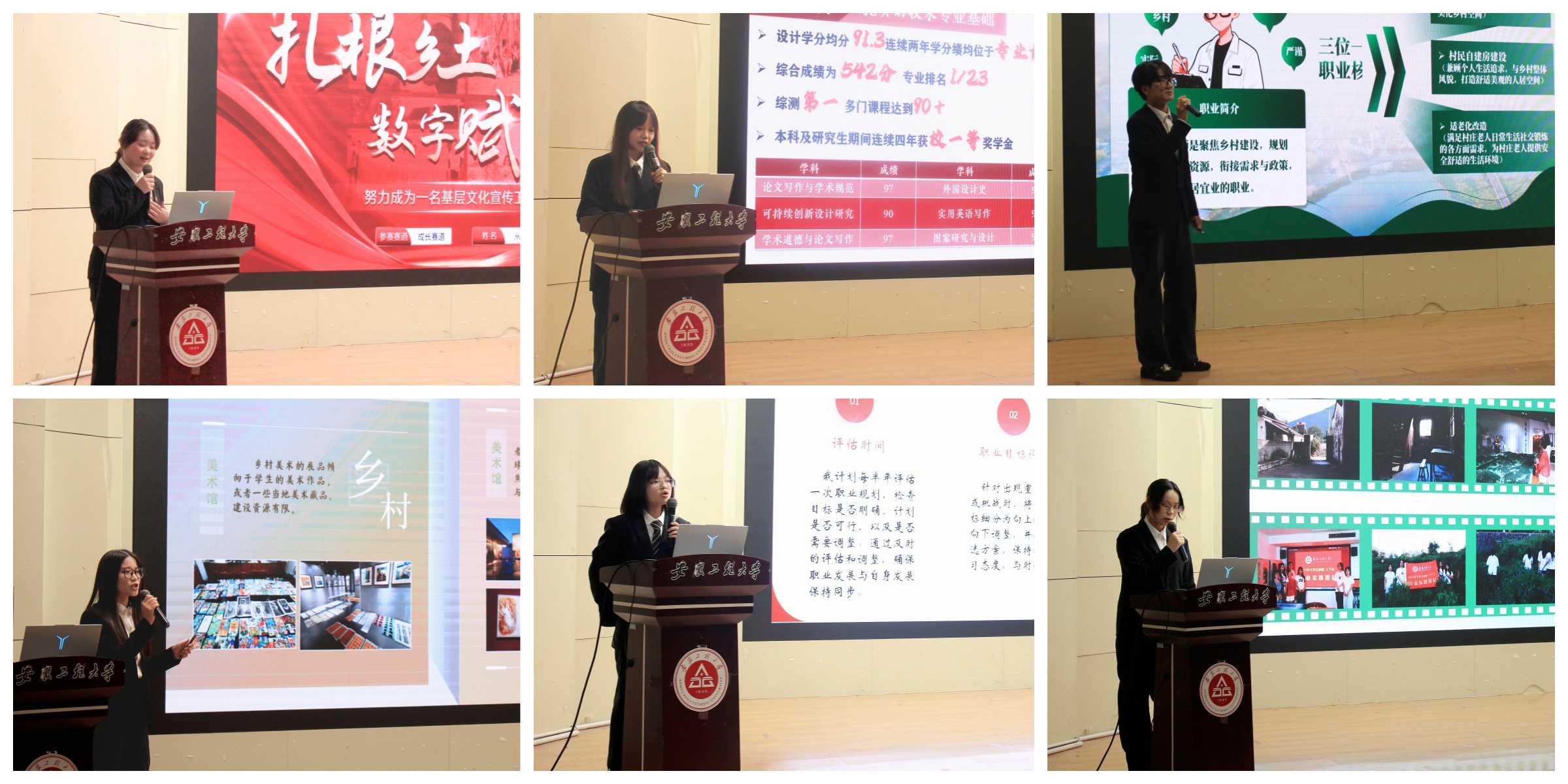 此次比赛分为就业赛道和成长赛道。经过学院的广泛宣传、策划组织和初赛评选,最终12名选手脱颖而出,进入院级决赛。决赛现场,选手们通过个人视频展示、职业生涯规划PPT陈述及现场答辩,全面展现了各自的职业理想、自我认知与成长路径。最终数媒231丛婷婷、设计研24王君获一等奖;广告251李佳悦、环设233叶宣志获二等奖。